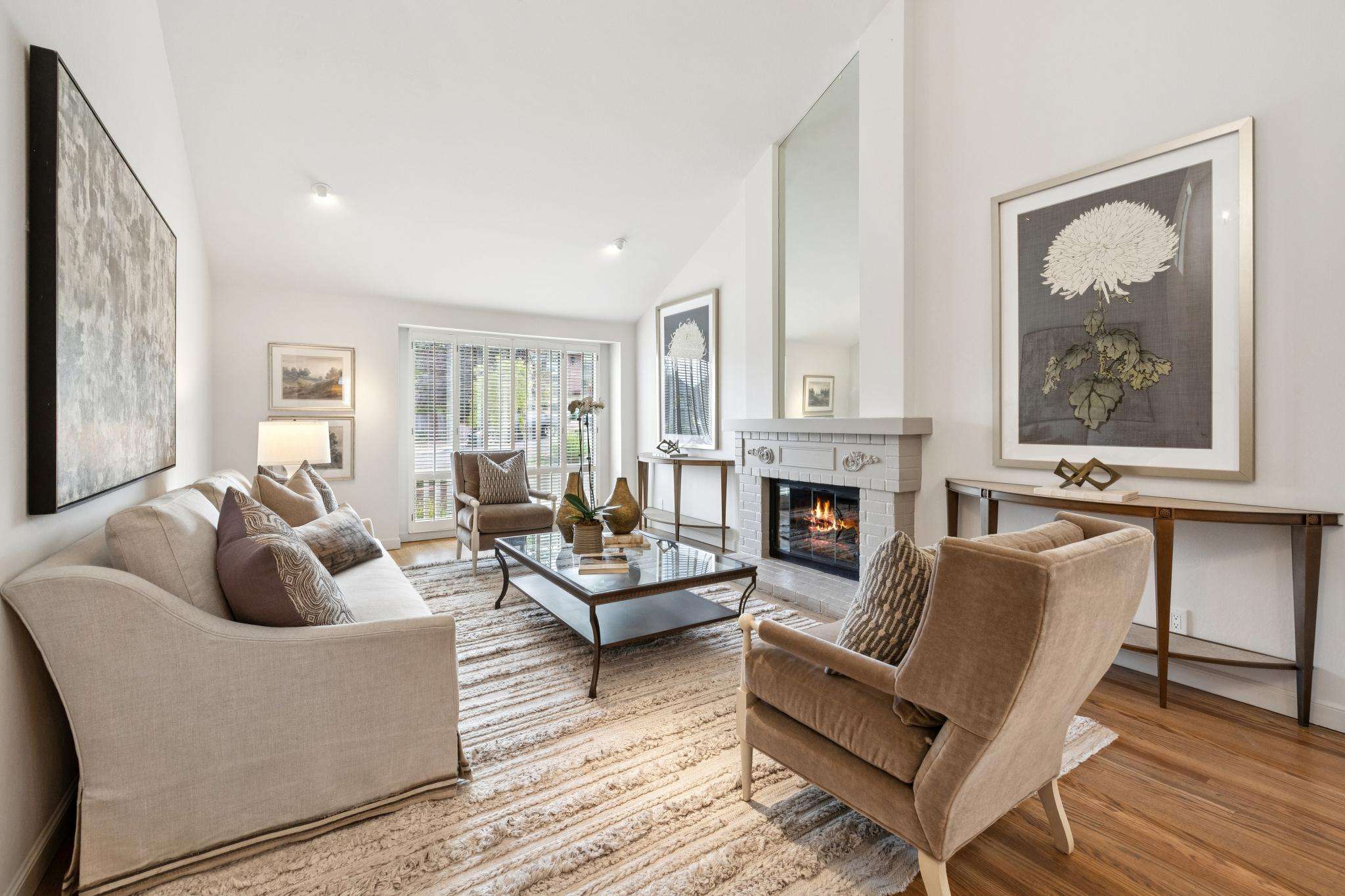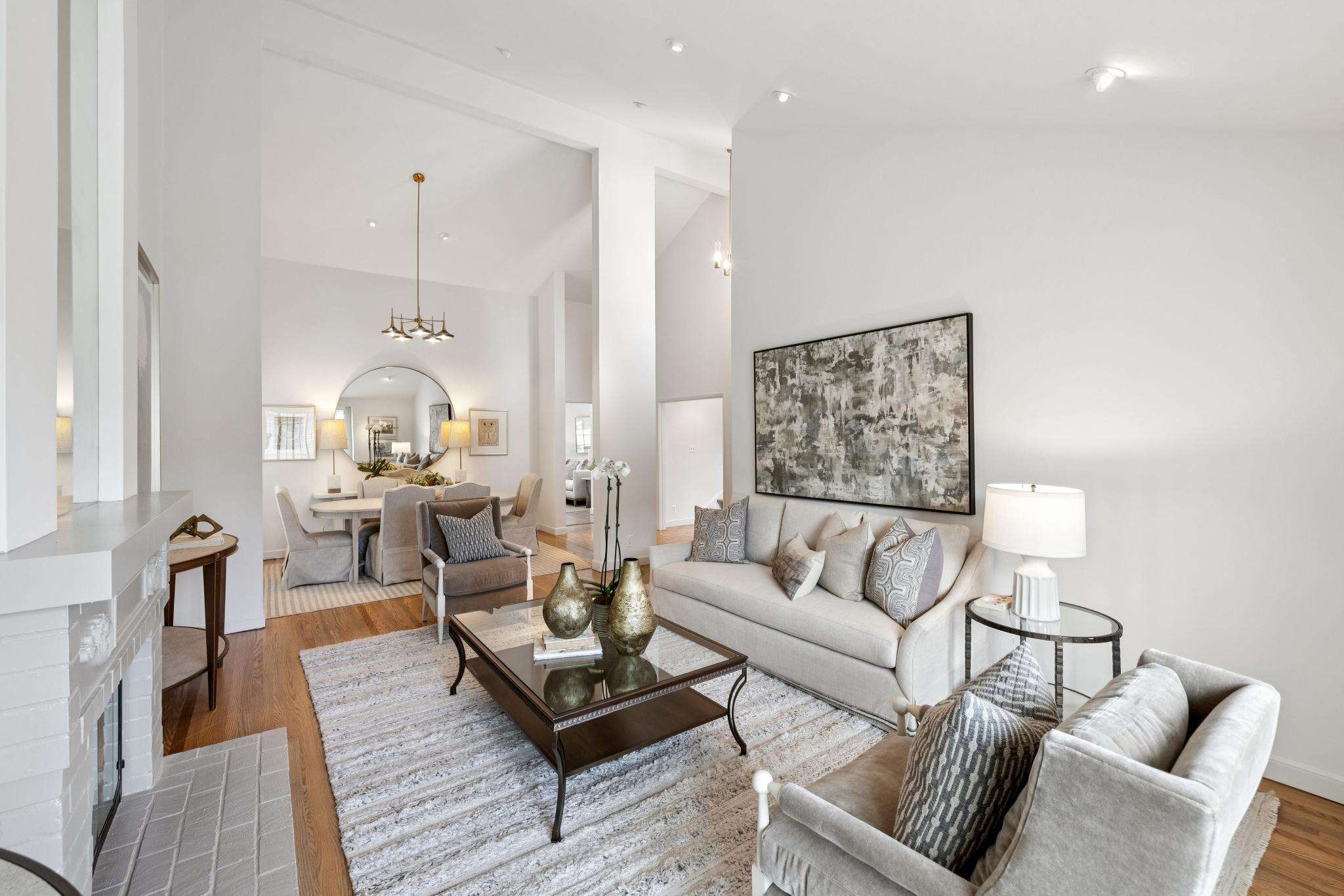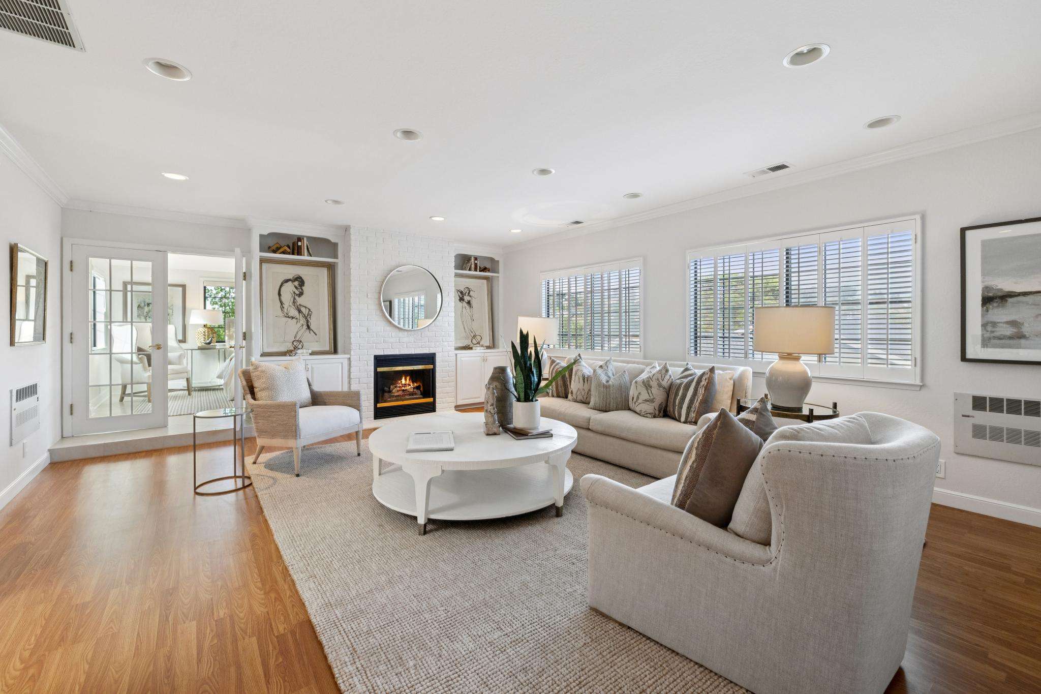 - Grand living room with a stately fireplace and adjoining elegant dining room set the stage for formal entertaining