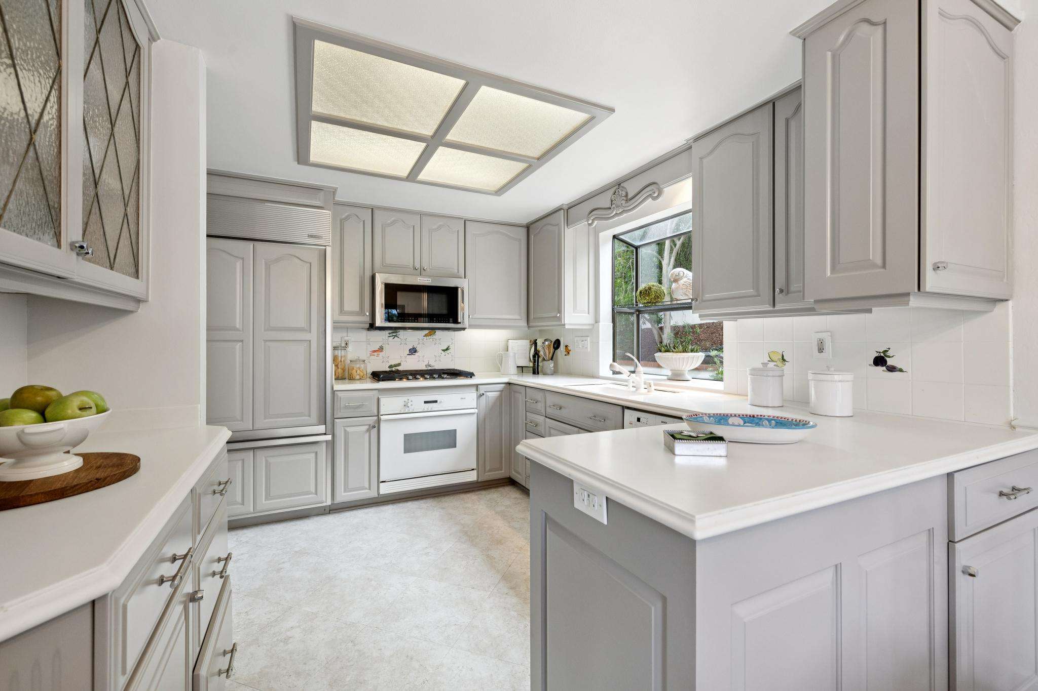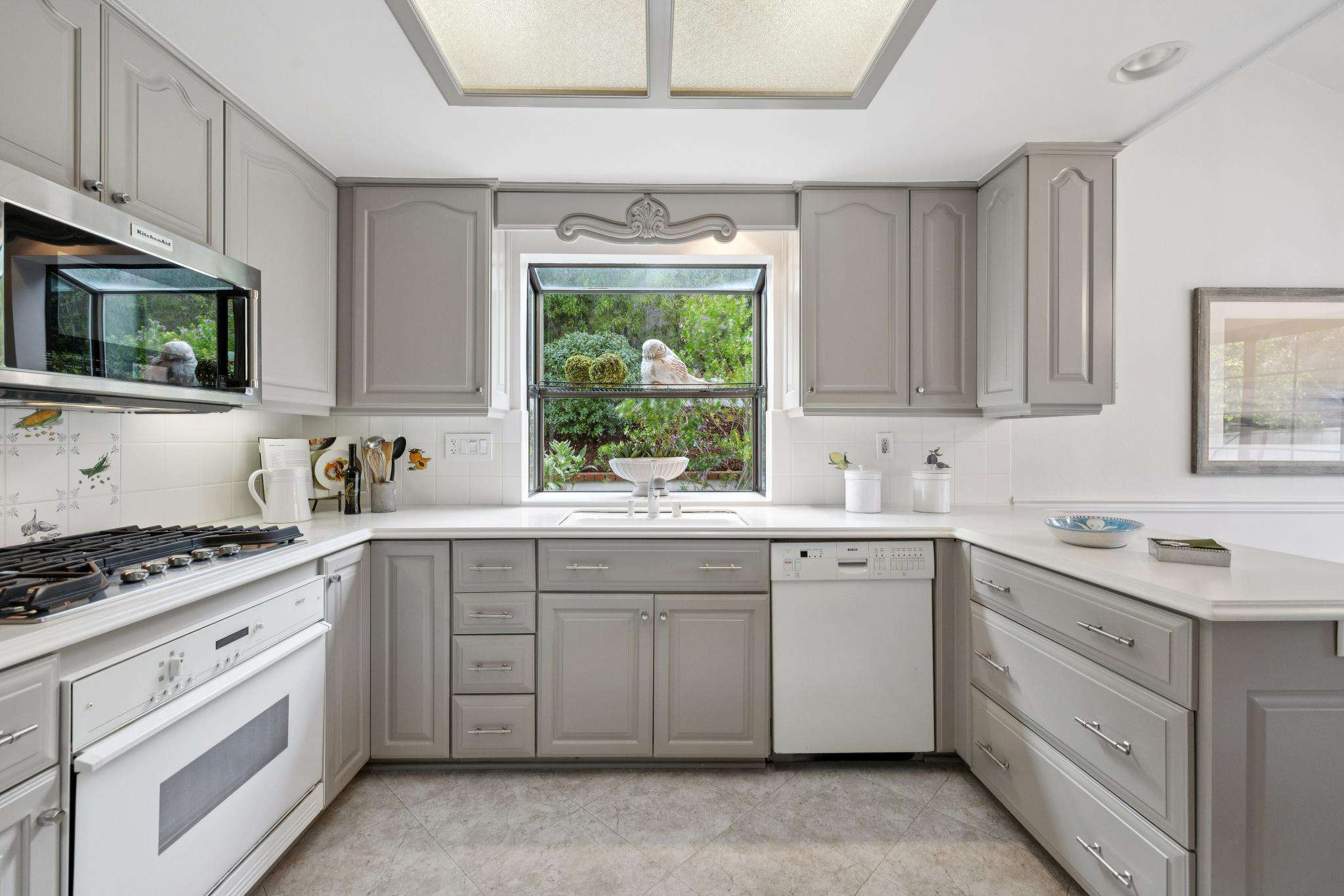 - Kitchen has newly painted cabinetry, solid-surface countertops, and appliances, which include a wood-paneled refrigerator, stainless steel five-burner gas cooktop and OTR microwave, a wall oven, dishwasher and porcelain sink beneath a garden window