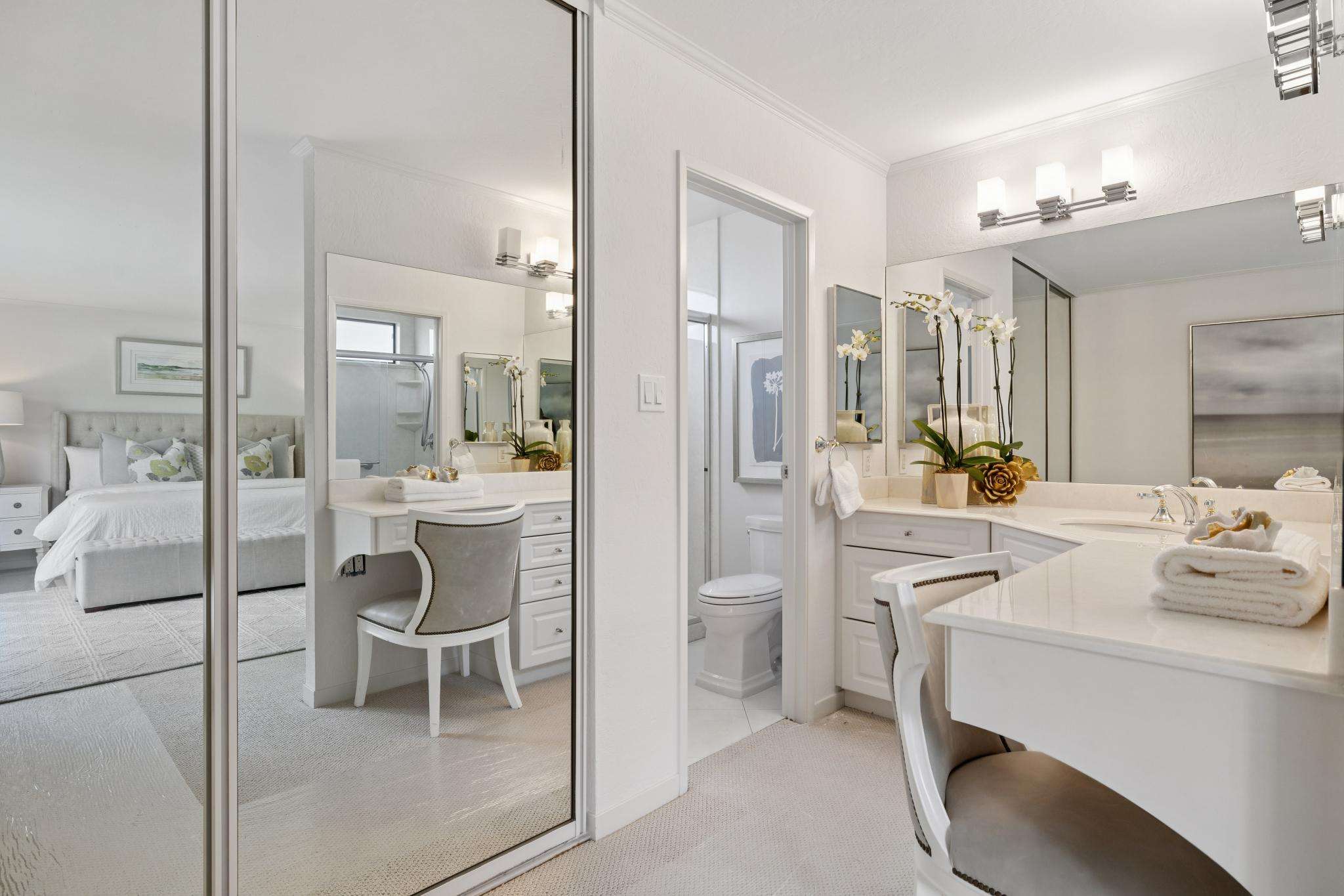 - Bathroom 1/hall bath has a dual-sink corner vanity with solid surface countertop, and water closet with tub-shower combo