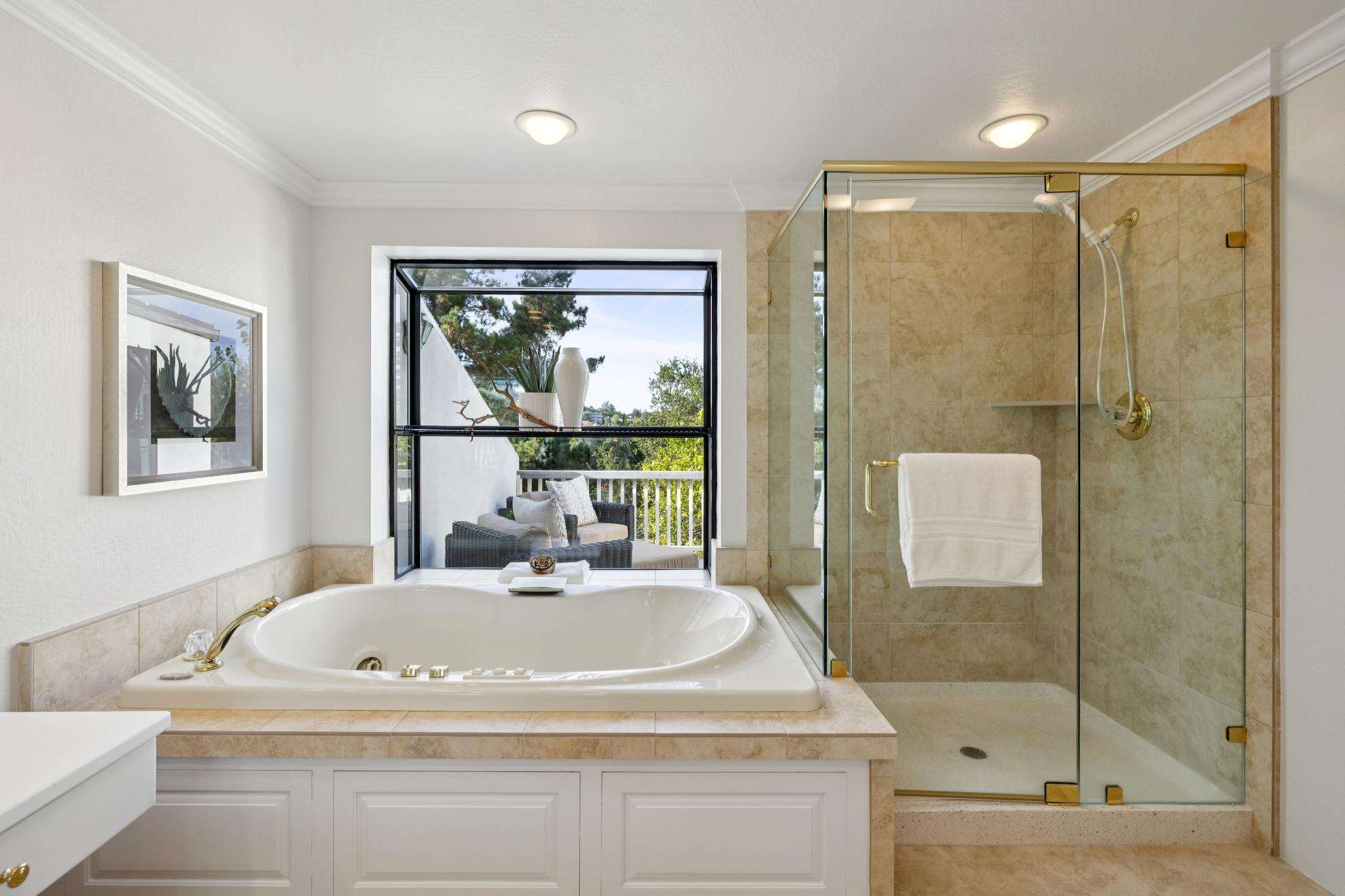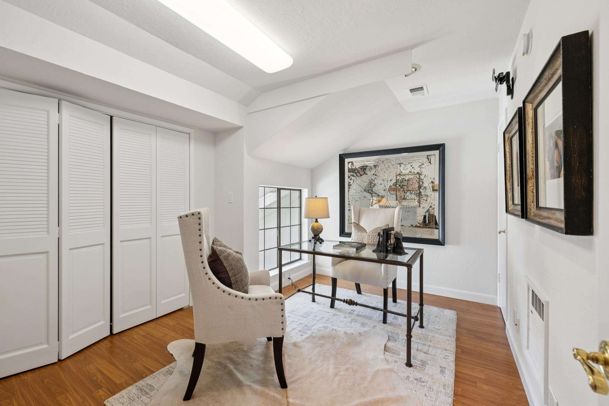 - A sky-lit, wood staircase ascends to Primary Suite 1, occupying the entire upper level with versatile ancillary rooms; featuring a large central room with hardwood floor, fireplace, kitchenette, large closet and skylit Bathroom with elevated tub and separate shower, a Bedroom/Office, privately situated Study with good natural light that could also be a workout or yoga studio, and double French doors to a tiled Sitting Room with wet bar and private terrace overlooking the backyard