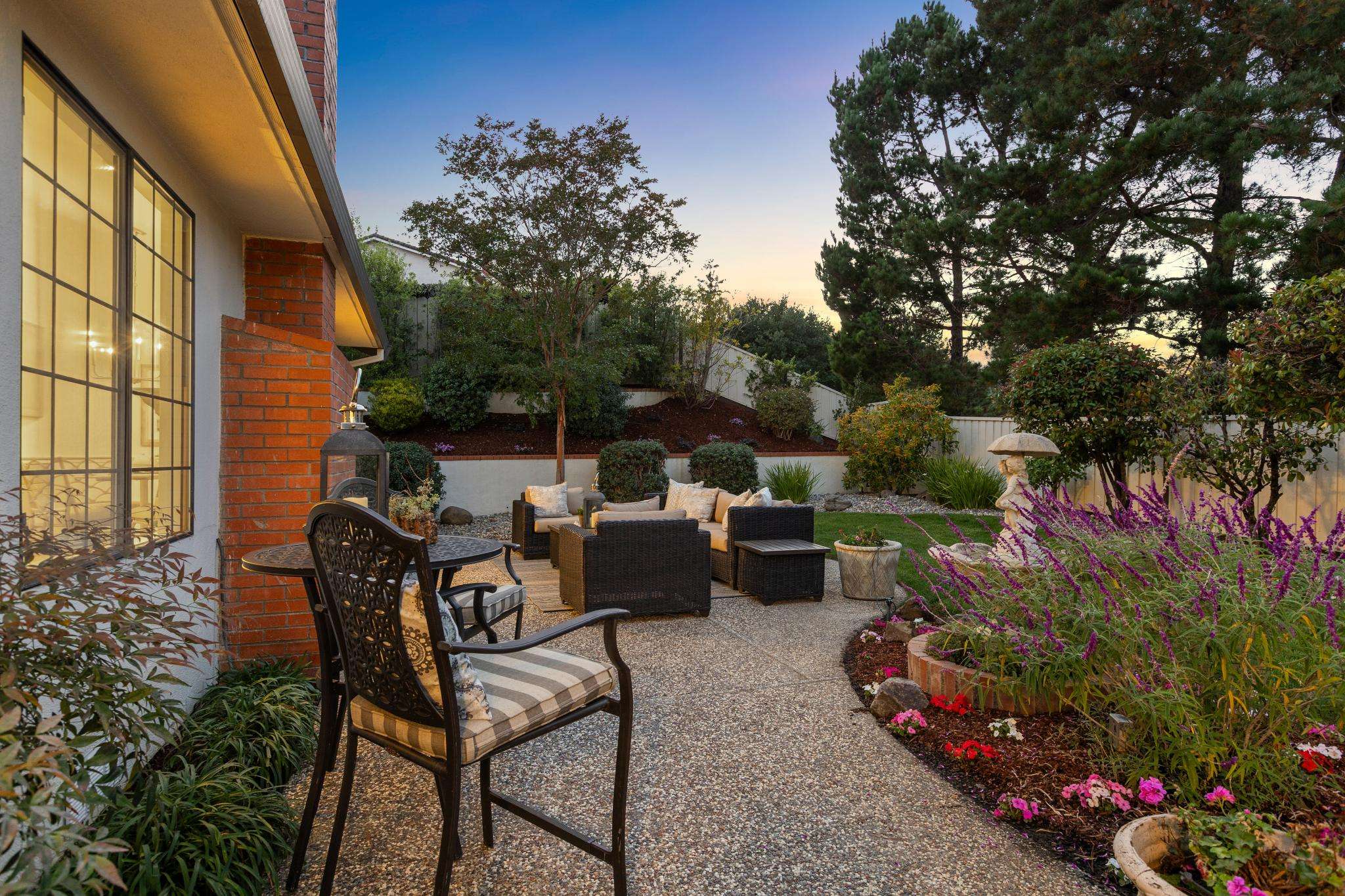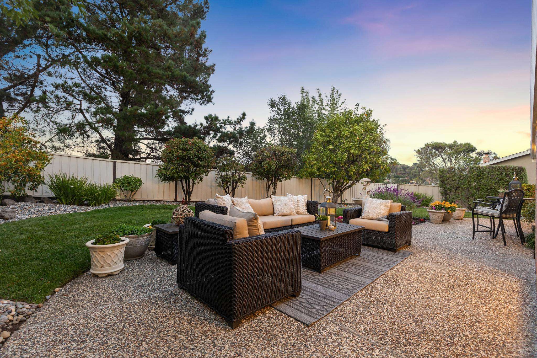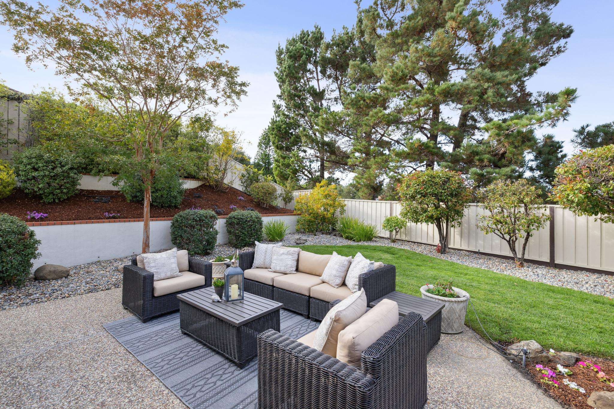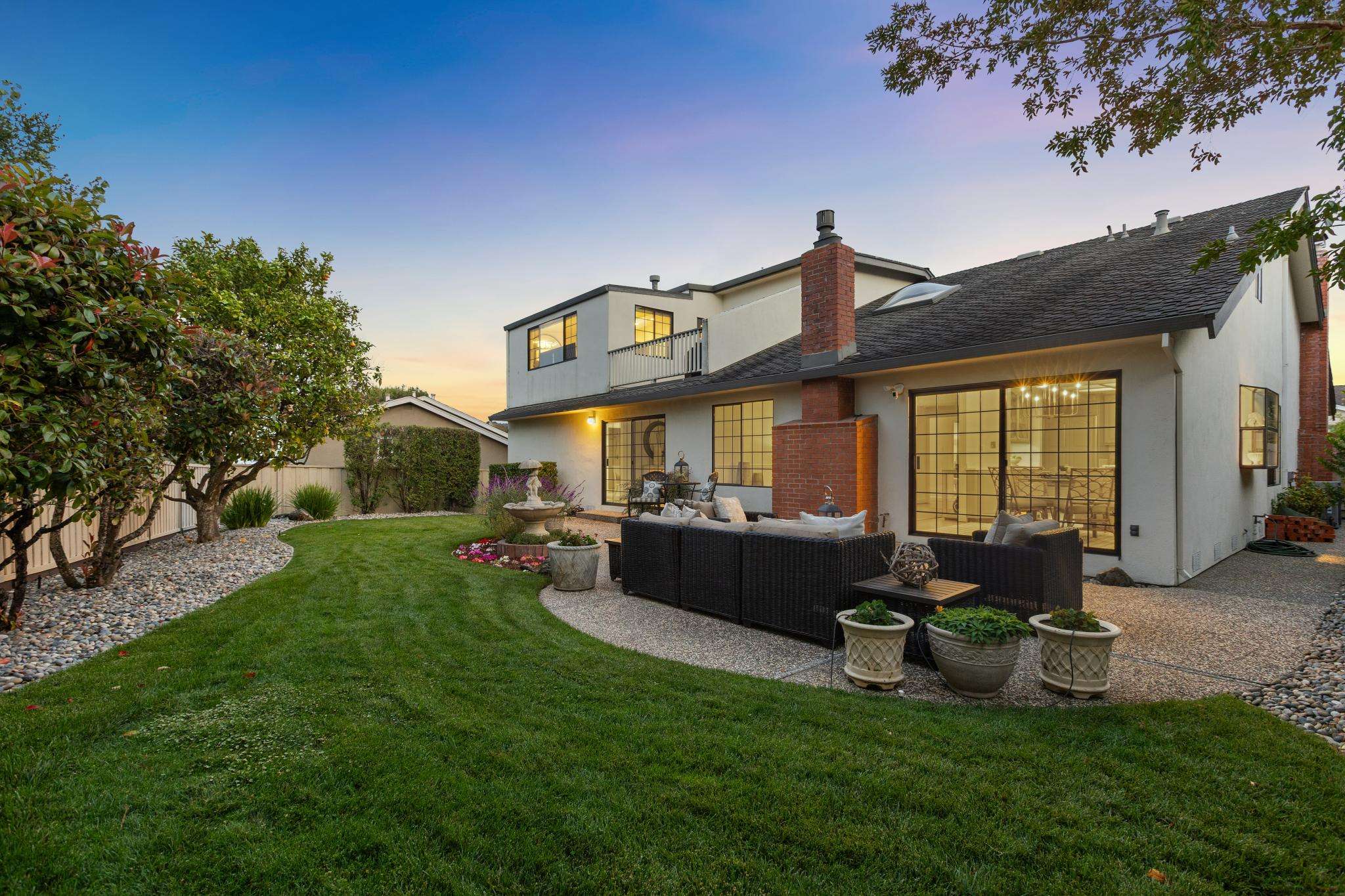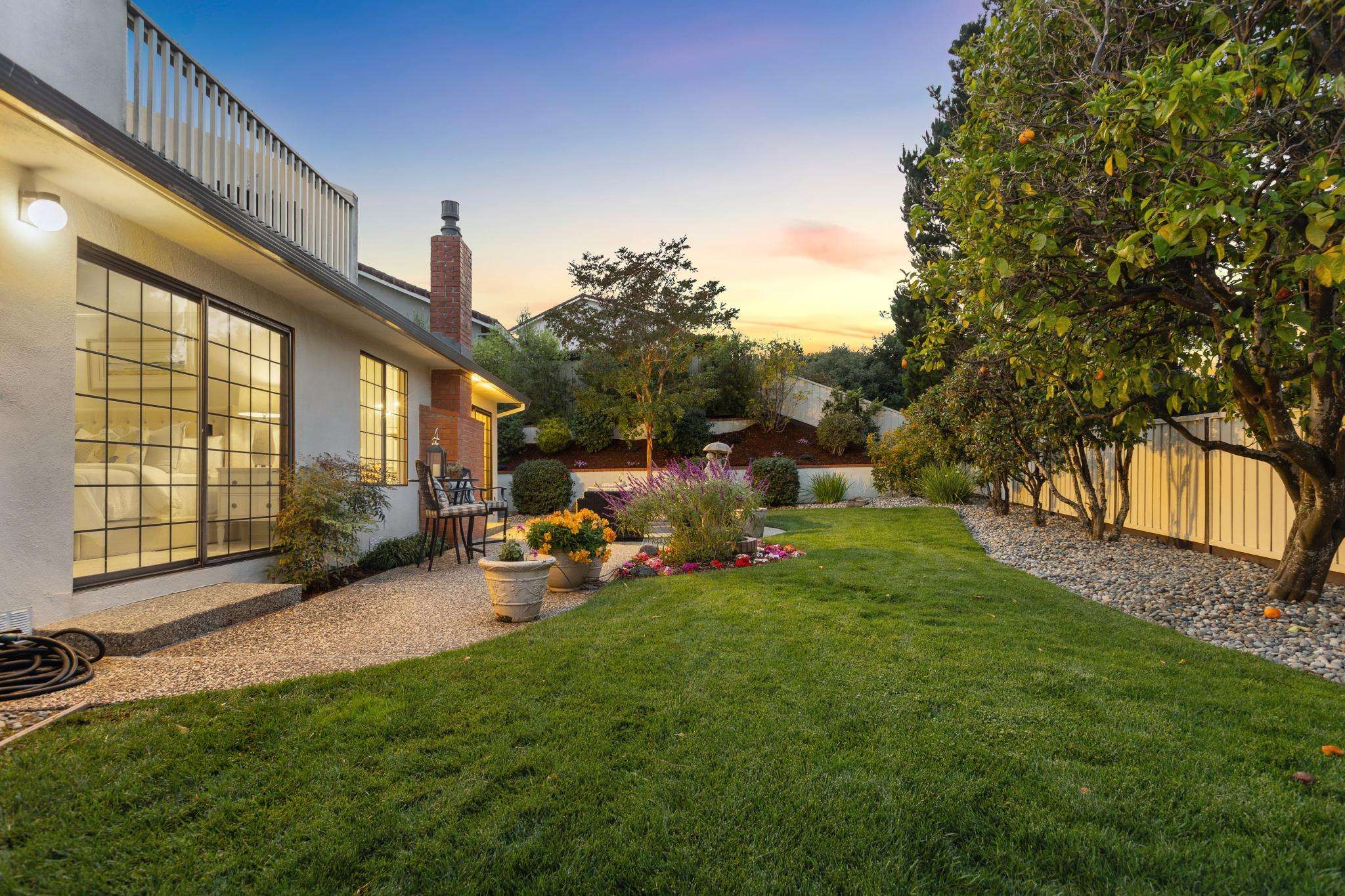 - Lovely, private back yard has an emerald lawn with lush perimeter trees and shrubs, a focal-point water fountain and sculpted patio that wraps to the side yard